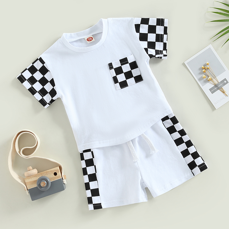 2Pcs Summer Clothes Suits Plaid Patchwork Short Sleeve Crew Neck T-Shirts and Shorts